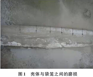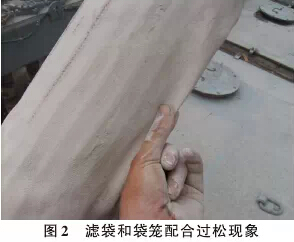 1 袋除尘器的应用概况 袋除尘器是一种干式滤尘装置。它适用于捕集细小、干燥、非纤维性粉尘。滤袋采用纺织的滤布或非纺织的 毡制成,利用纤维织物的过滤作用对含尘气体进行过滤。当含尘气体进入袋除尘器后,颗粒大、比重大的粉尘, 由于重力的作用沉降下来,落入灰斗;含有较细小粉尘的气体在通过滤料时,粉尘被阻留,使气体得到净化。我国 "十二五"规划对环境保护提出了更高的需求,水、气、声、渣都将更多的应用过滤材料,过滤材料行业市场前景 看好。其中在烟尘治理领域,袋除尘器由于除尘效率高、不会造成二次污染和便于回收干料等性能,在国内外的 应用越来越广,占所用除尘设备的80%。目前,我国的袋式除尘技术达到了国际先进水平,能够满足日益提高的环 保要求,可为国民经济的可持续发展创造良好的条件。 虽然袋除尘器具有很多的优点,但一旦滤袋失效,将造成设备的故障排放,粉尘超标,另滤袋的更换也是一 笔巨大的费用。如何在使用中认识到滤袋失效问题并加以注意,进而避免发生显得尤其重要。下面就水泥工业领 域现场经常出现的滤袋失效问题,进行总结和分析。 2 滤袋失效 2.1 机械磨损失效 (1)滤袋与袋笼之间的磨损。滤袋在袋笼相应的环筋位置出现孔洞,很明显是由于袋笼上的毛刺磨损滤袋造成 的(如图1)。这种磨损的避免或减少,需要在袋笼制作过程中严格控制袋笼的质量,任何毛刺、飞溅、开焊、断筋 都要禁止,否则装入除尘器后,这些缺陷将直接影响滤袋的使用效果,大大缩短滤袋使用寿命。(2)滤袋与壳体之间的磨损。由于设计或安装的原因,滤袋在安装后出现和壳体(或内部管撑)干涉,或滤袋距 离壳体过近导致滤袋在喷吹时晃动与壳体进行摩擦,使用一段时间后,滤袋在和壳体接触的部位出现孔洞,造成 滤袋的破损。目前,在除尘器壳体设计中,一般考虑滤袋距壳体的距离至少保持75mm以上。由于花板的平整度、 水平度、袋笼的垂直度等均有偏差,安装调整后的滤袋和壳体之间的距离要保持在60mm。 (3)滤袋和袋笼的配合过松(如图2),在使用中致使滤袋与袋笼之间的破损。在水泥生产线窑尾普遍选用玻纤 滤袋,其基布采用的玻璃纤维,最大的缺陷是不能抗折,若在使用中不能固定在袋笼上,袋笼失去了支撑的意义, 在工作和清灰两种状态下,滤袋的纤维很容易疲劳断裂,造成滤袋的破损。这就要求,在滤袋和袋笼批量生产的前 期进行配合试验,以确定袋笼和滤袋的最佳尺寸。以玻纤覆膜滤袋为例,名义直径Ф160 mm,袋笼采用 24 根纵筋, 直径Ф156mm,理论周长490mm,而滤袋半周长(外径)为250mm,考虑滤袋的厚度,这样配合的滤袋和袋笼,用手指 轻压滤袋而不会有太大的变形,能紧紧固定在袋笼上。
