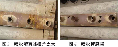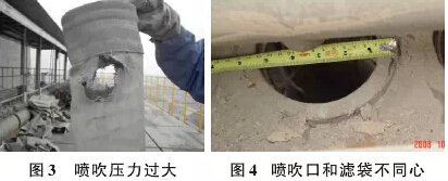 (2)灰斗进风除尘器的袋底磨损。采用灰斗进风方式的除尘器,在使用中滤袋底部由于受气流的冲刷,呈现一 面磨损的情况,这主要和进风方式有直接的关系,若灰斗内部导流板及阻流板加设合理也可避免这种情况的发生。 采用侧向进气方式的除尘器则可有效预防袋底的磨损。 (3)喷吹管问题引起的袋口磨损。喷吹管喷吹口的直径大小相差太大造成喷吹气流不均、喷吹管制作质量差造 成磨损、喷吹管安装问题引起的喷吹管孔和滤袋不同心等等情况,都会造成滤袋口部的破损(如图5和图6)。