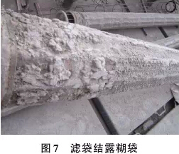 (1)温度过低。在烟气中不可避免地都存在水分,过低的温度容易引起滤袋表面的结露,液态水和粉尘聚集成 颗粒粘接在滤袋表面,不易清理,时间久了造成滤袋透气性变差,阻力升高,失去作用(如图7)。处理时首先要弄 清是什么原因造成的温度过低,如是保温问题致使袋室周边温度降低,还是漏风引起的温度下降,还是工艺系统 决定的入口温度过低等,然后再针对性采取相应的技术措施。