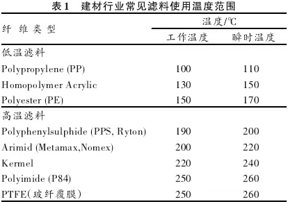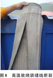 (2)温度过高造成的滤袋烧毁。任何滤袋都有正常的温度使用范围,其用料决定了上限温度,超出这个温度, 对滤袋造成的损失是不可逆转的。以玻纤覆膜滤料为例,其正常使用温度范围小于260℃,这个温度值是针对基布、 覆膜和缝线而言的,超出这个温度值,三种材料中的任何一种出现问题必将导致滤袋的失效。在此温度下,滤料 可短时间工作,超出此温度,易造成滤料不可恢复的永久损伤,滤袋的使用寿命降低甚至损坏。因此,使用中应 密切关注除尘器的入口温度,严禁超温运行。当温度超过220℃时系统应启动保护程序,防止烧袋的发生。对有高 温报警的控制系统,上限宜调整到220℃。其它各种滤料都有各自的使用温度,在实际工作中,应根据不同的滤料 设置不同的报警温度。 建材行业常见滤料使用温度范围见表1。如:广泛用于水泥生产线窑头的Nomex滤袋,正常使用温度范围达200~ 240 ℃,但由于窑头温度变化快,建议报警温度设置在 200 ℃左右,一旦超温,系统中的冷风阀开启或除尘器上 的出口阀门关闭等措施保证滤袋不受高温损坏。图8为使用温度超过 280 ℃后玻纤覆膜滤袋缝线断裂的情况。
