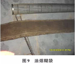 2.4 投运初期缺少预处理造成的滤袋失效 新的除尘器在投运前要采用生料粉对滤袋表面进行预涂层,以免点火时油烟粘附在滤袋表面清除不掉,有些 生产线的操作者急于投产,不注重或省略这项工作,造成不可逆转的滤袋阻力增大,见图9。