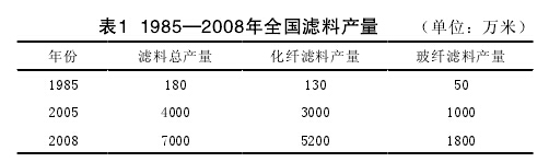 在滤料品种不断创新的同时,滤料的产量也在飞速发展。1985—2008年国内滤料产量情况见表1。