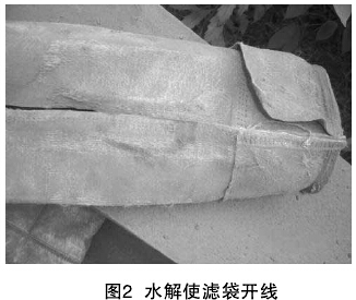 缝纫线发生水解后,滤袋从缝纫线处开裂,使滤袋不再是筒状而成为一块布(见图2)。