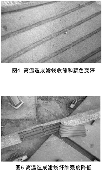 架,从而在滤袋内表面形成深深的痕迹(如图4所示),并使得滤袋纤维玻璃化变得极其脆弱,强度降低。图5为广