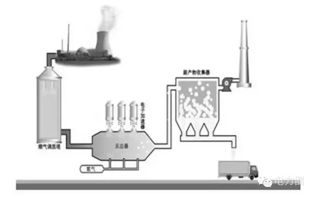 原理:用高能电子束照射烟气,生成大量的活性物质,将烟气中的SO2和氮氧化物氧化为SO3和二氧化氮(NO2),进一步生成H2SO4和硝酸(NaNO3),并被氨(NH3)或石灰石(CaCO3)吸收剂吸收