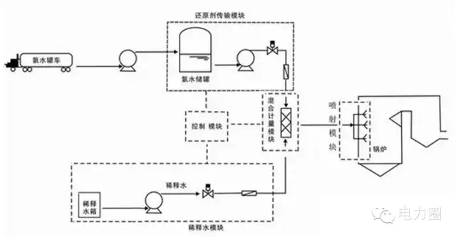 SNCR/SCR混合法脱硝系统主要由还原剂存储与制备、输送、计量分配、喷射系统、烟气系统、SCR脱硝催化剂及反应器、电气控制系统等几部分组成。