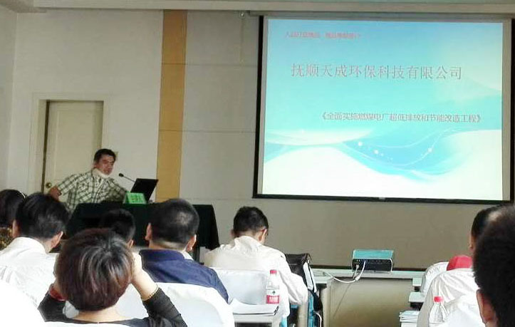 我公司辽宁天舜环保工程有限公司技术负责人韩忠诚上台发表了技术推介,就议题阐述了我公司在全面实施燃煤电厂超低排放和节能改造上取得的一些成就,参与的国家项目,并针对烟气超低排放提出了一项我公司独有的,受国家专利保护的改造方案,受到各公司高度重视。